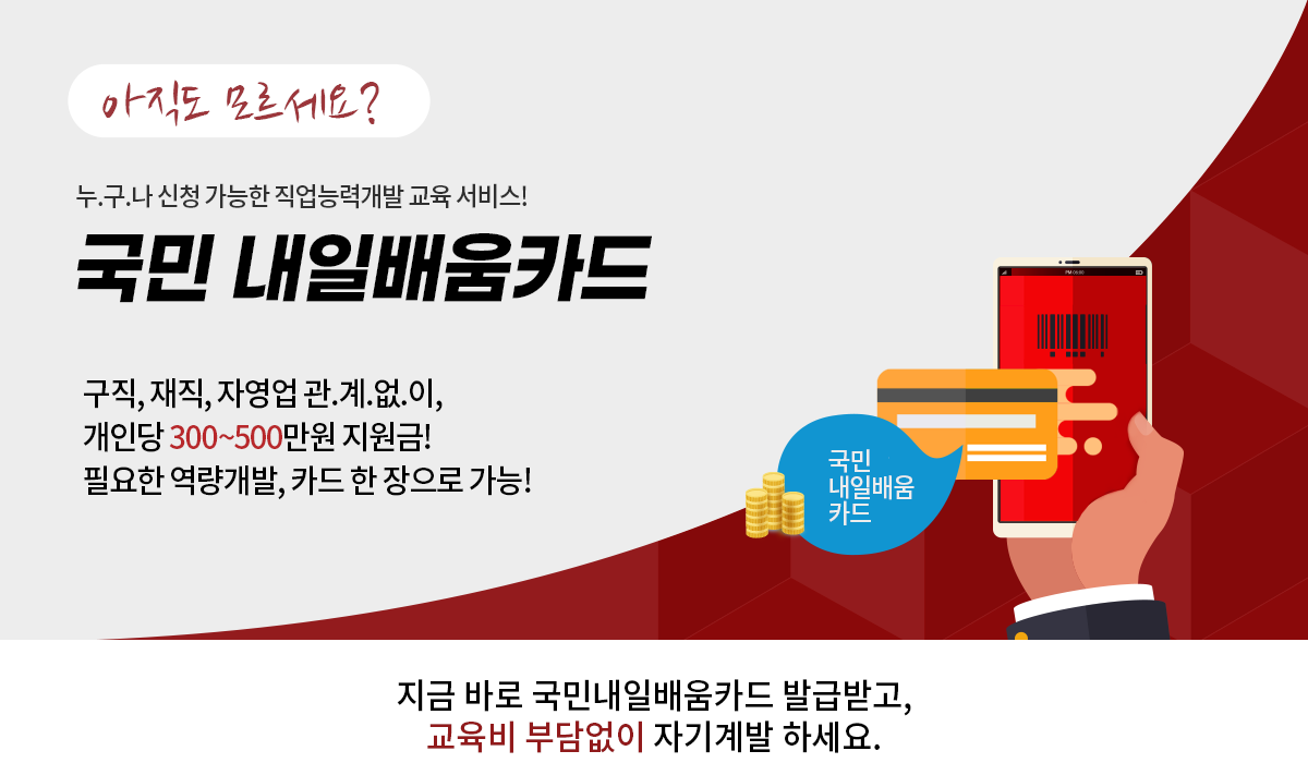 국민내일배움카드는 구직, 재직, 자영없 관계없이교육비를 지원받을 수 있는 정부지원 교육비 카드입니다.